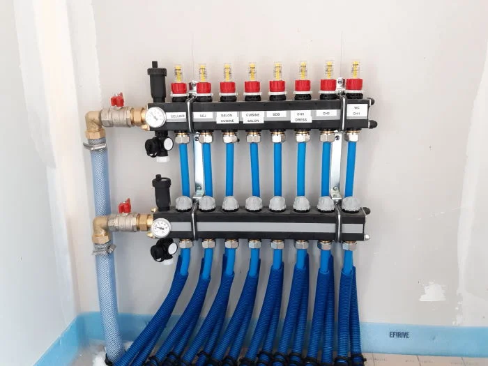 Pose d’un collecteur appelé aussi nourrice permettant d’alimenter en eau chaude toutes les boucles de tuyaux du chauffage au sol, ainsi que de réacheminer l’eau froide qui a déjà servi à chauffer les pièces – une identification est faite pièce par pièce.