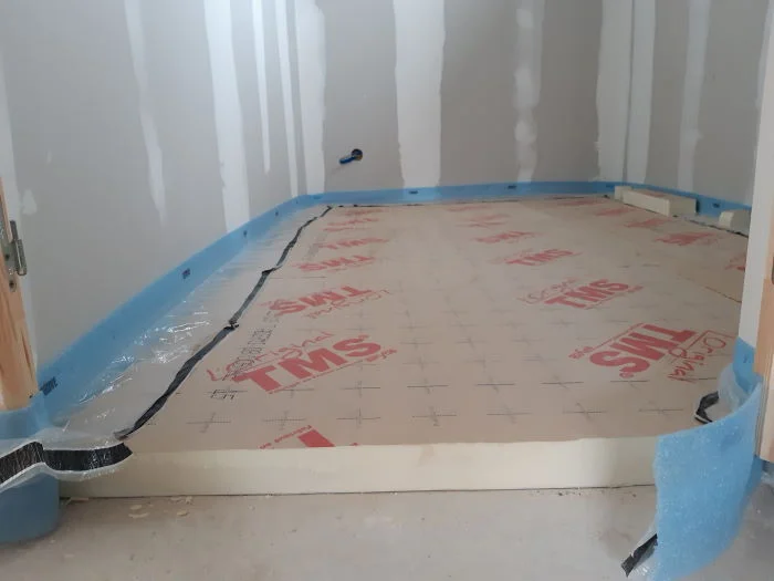 La mise en œuvre d’un isolant de sol de type polyuréthane sous chape flottante (isolant de sol TMS), épaisseur variable retenue en conformité avec les prescriptions du bureau d’études thermiques.