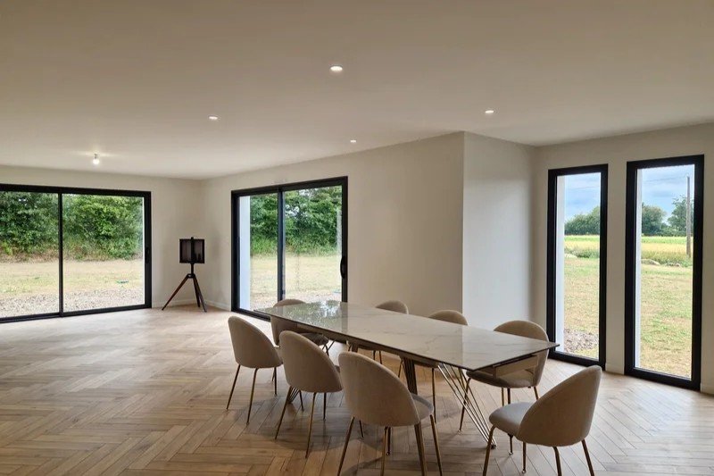 Fourniture et pose des menuiseries de type baies coulissantes, fenêtres, ouverture à frappe, porte de garage et porte d’entrée. Lors de la réalisation du descriptif chiffré, sera joint les références produits ainsi que les fonctionnalités de celles-ci (oscillo battant, type de fermeture électrique, couleur et matière employées…).