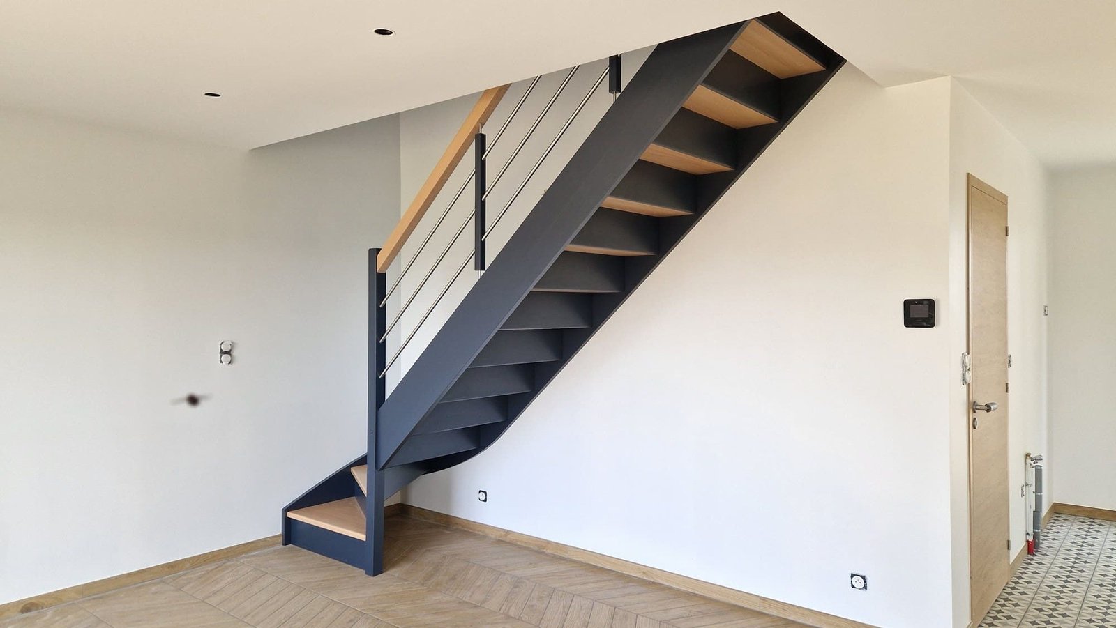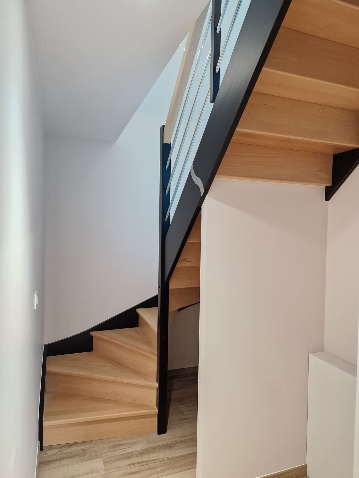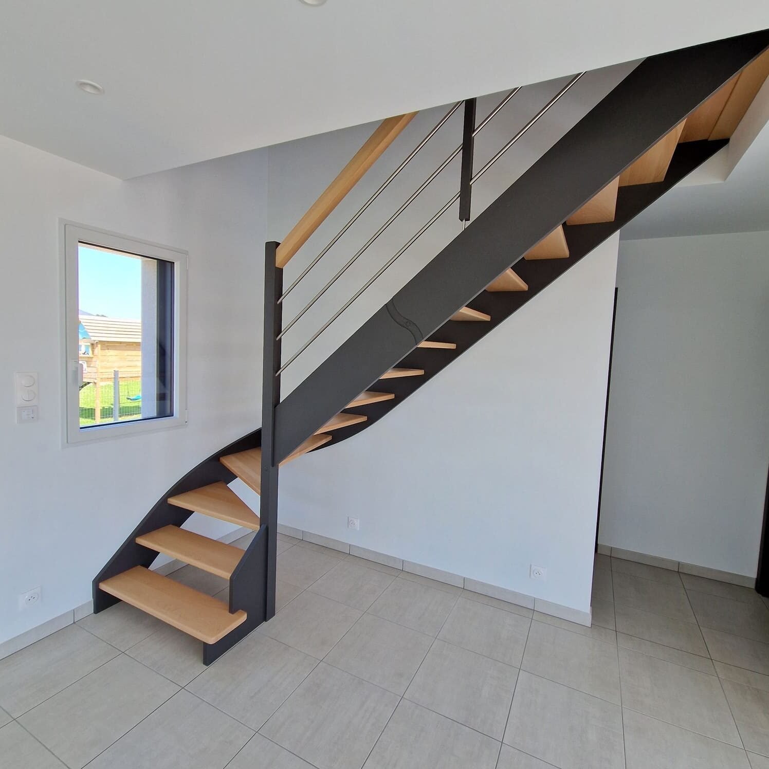 Fourniture et pose de nos escaliers par la société Riaux Escaliers. Tous nos escaliers sont réalisés sur mesure, fabriqués et finis (vernis, peint) en atelier. Un savoir-faire 100% français depuis 1977.
